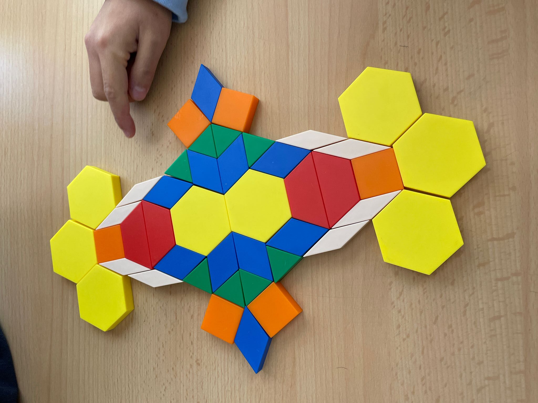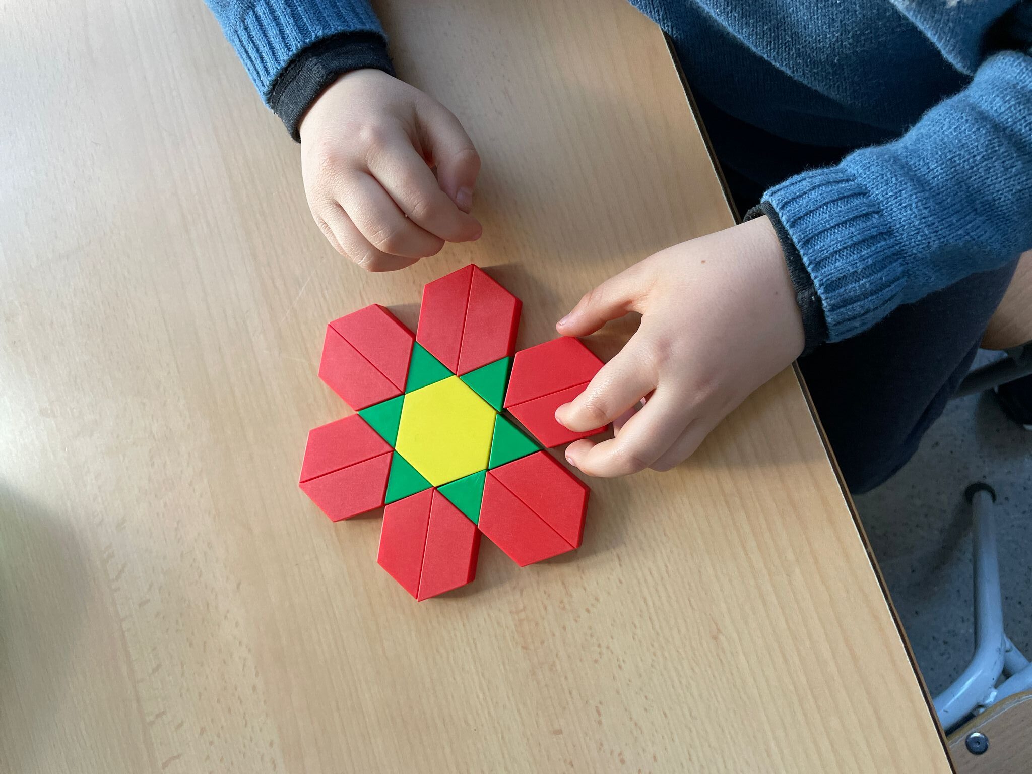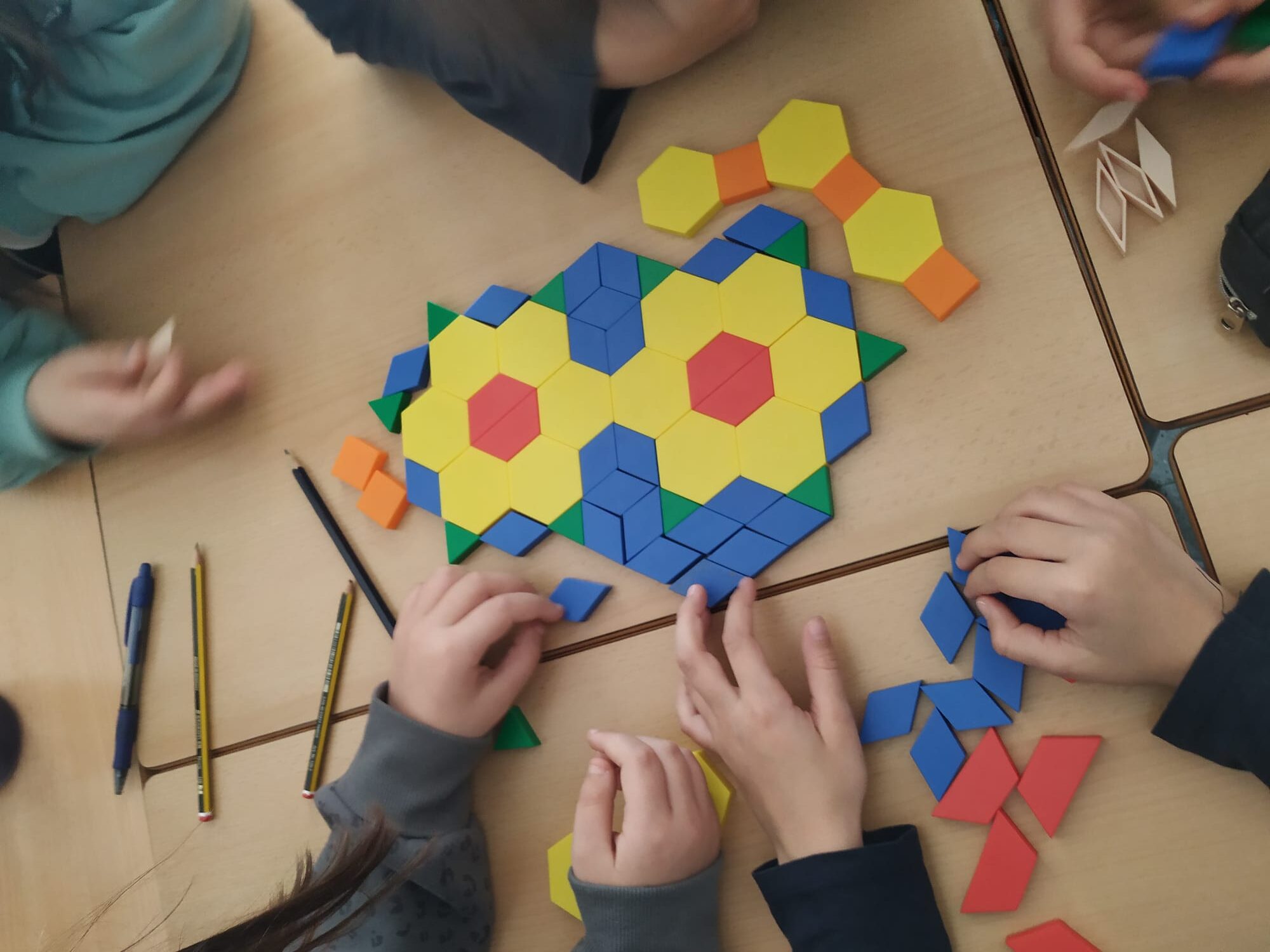 Sense mirar i només tocant la peça, anaven endevinant quin polígon era a través de preguntes com “Té 4 costats?” “Té 3 vèrtexs?” i només responent “Sí” o “No”. Després, van començar a crear mosaics combinant els colors i les formes amb totes les peces que tenien.
