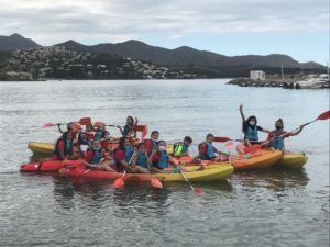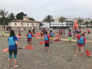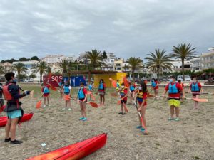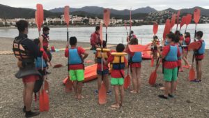 Ben dinat a les taules de fora de l’alberg, hem estat jugant fins que els monitors ens han vingut a buscar per anar a començar l’esperada activitat de la tarda: kaiac i jocs a la platja.