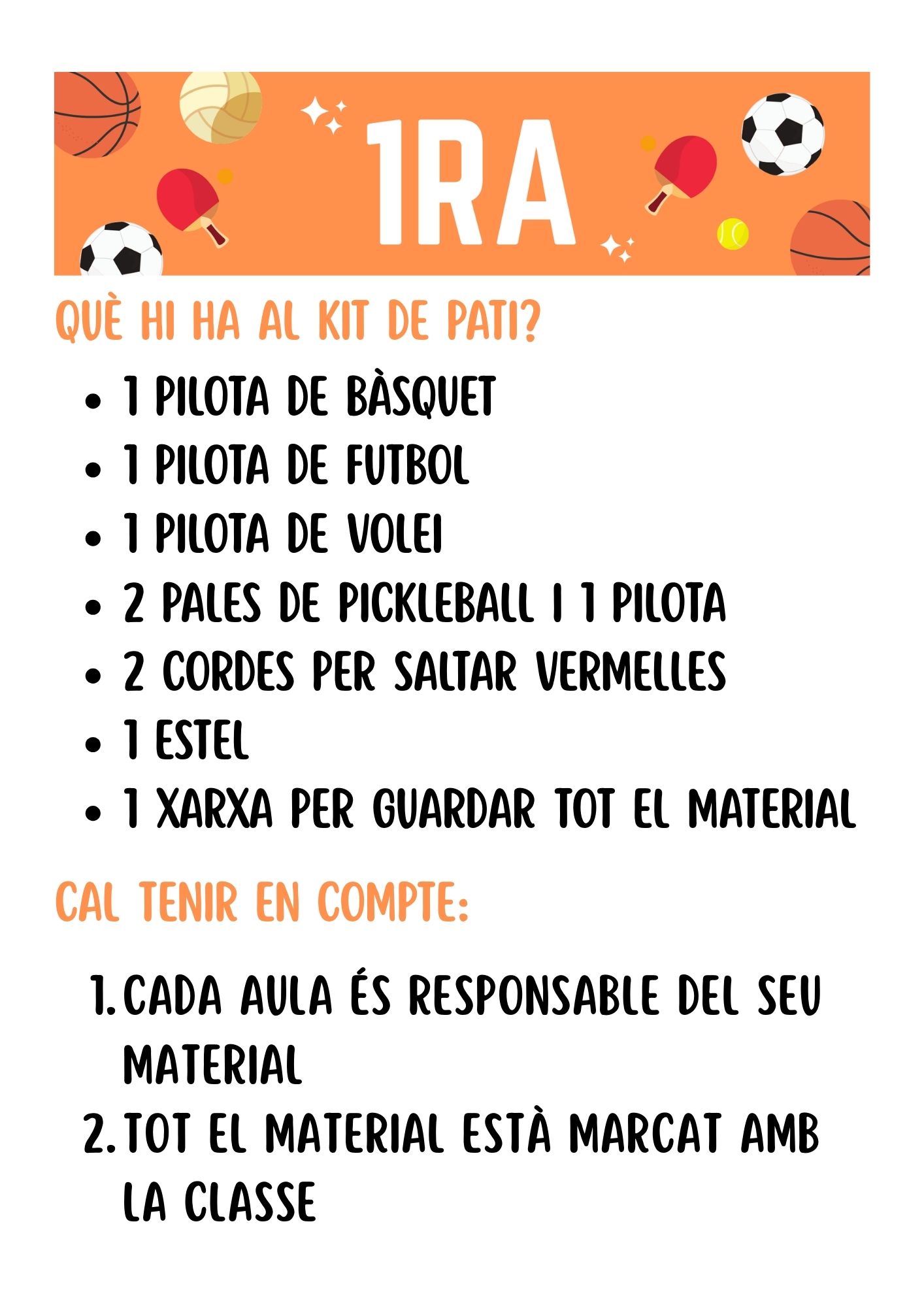 Les classes de Primària ja disposen del seu nou kit de pati, un conjunt de materials pensats perquè l’alumnat pugui gaudir d’estones d’esbarjo més actives, divertides i compartides. Aquest kit ha sorgit del propi alumnat, petició feta a l’assemblea de delegats/des.