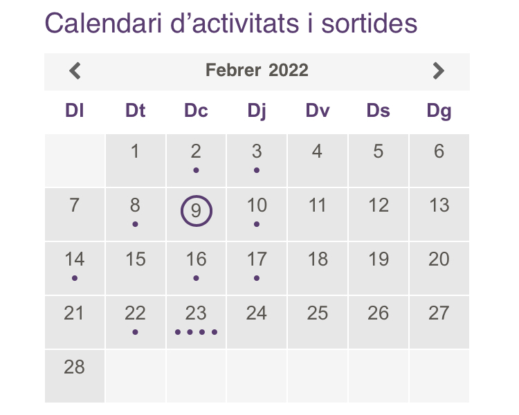 Ja podeu consultar les activitats i sortides previstes durant el curs al calendari que trobareu al bloc de l’escola. Si accediu amb mòbil o tauleta el trobareu clicant a Ginys i amb ordinador el podeu trobar a la part esquerra de la pàgina. Clicant els puntets veureu les sortides i activitats de cada dia.