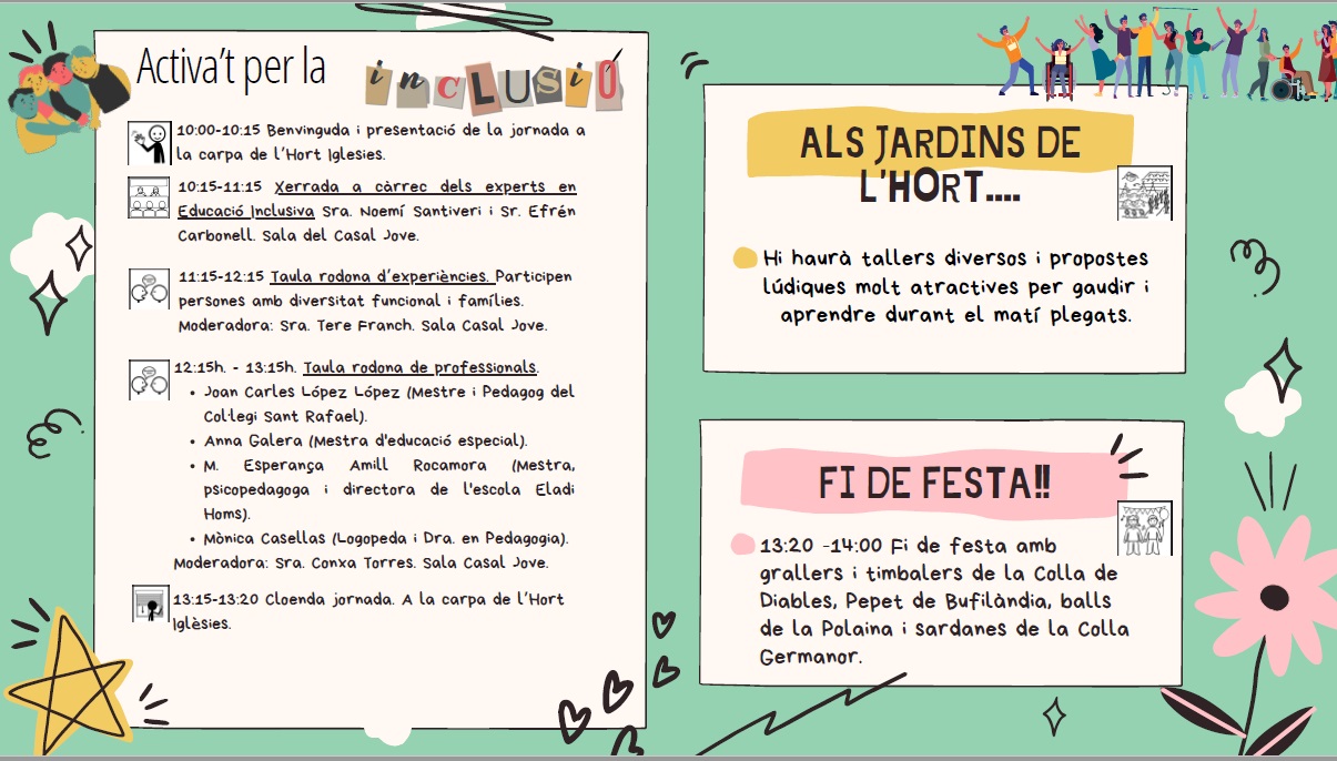 La PLATAFORMA CIUTADANA PER UNA ESCOLA INCLUSIVA A TARRAGONA I LES TERRES DE L’EBRE ha organitzat, per a aquest proper dissabte 13 de maig, una jornada festiva a la Selva del Camp, amb tallers, xerrades i activitats diverses per tots els públics,