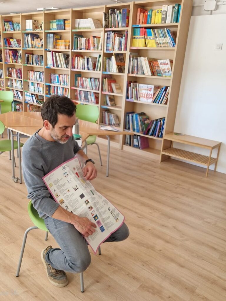 Ha estat un plaer compartir una estona amb ell, escoltant les seves anècdotes i descobrint què hi ha darrera de la seva obra. Per donar-li les gràcies, li hem lliurat una auca del llibre personalitzada i uns minibooks creats a l’aula.
