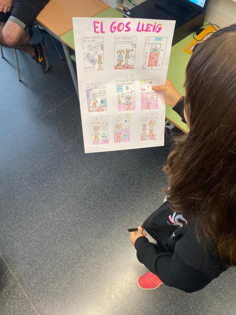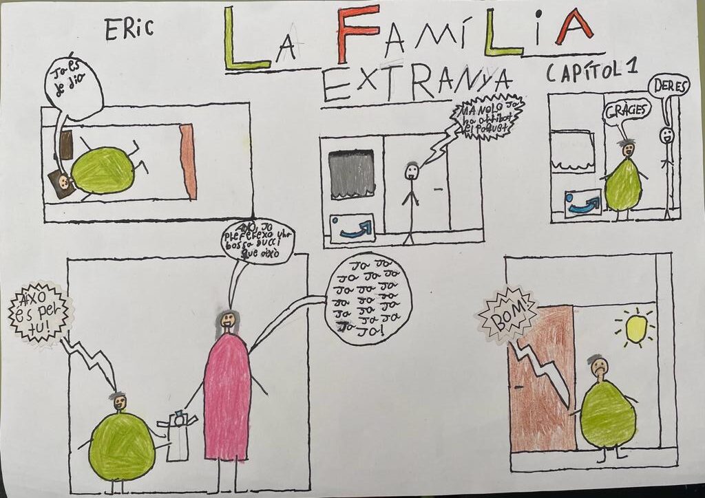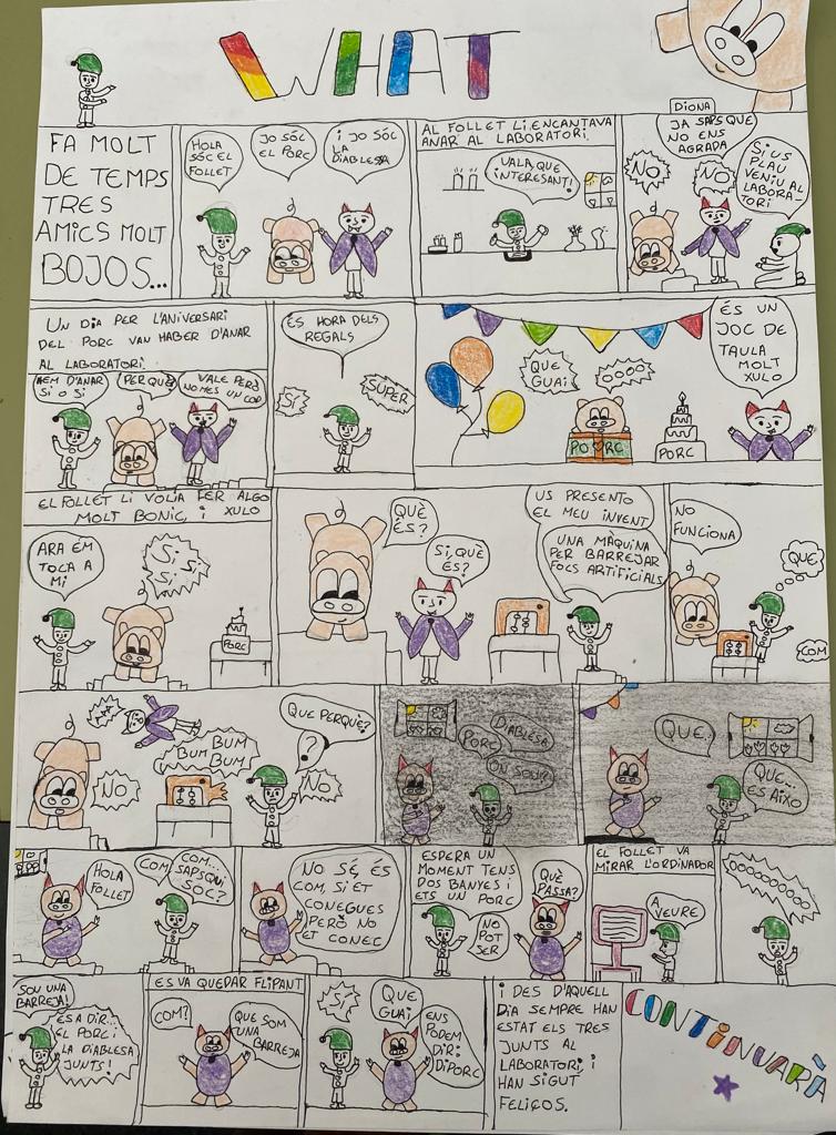 Dilluns 25 de setembre, a text lliure, vam començar una història. El dilluns segĂĽent vam llegir-ho a la classe. A l’hora de plĂ stica vam engegar el còmic, però amb la història que havĂem fet al dilluns passat. Ens van explicar com fer-ho: com fer les bafarades, si crides, si parles o si penses. Com llegir-ho: d’esquerra a dreta. TambĂ© com escriure-ho, per exemple: si vols que ho digui un drac: – hola-, abans que un elefant has de posar la bafarada del drac mĂ©s alta que la de l’elefant. Ho vam fer amb brut, desprĂ©s ho vam fer en net, en una cartolina D3 i amb llapis. I per Ăşltim ho vam resseguir amb punta fina negra i ho vam pintar. Ho hem presentat i….👌 Ens ha semblat molt entretingut i divertit.