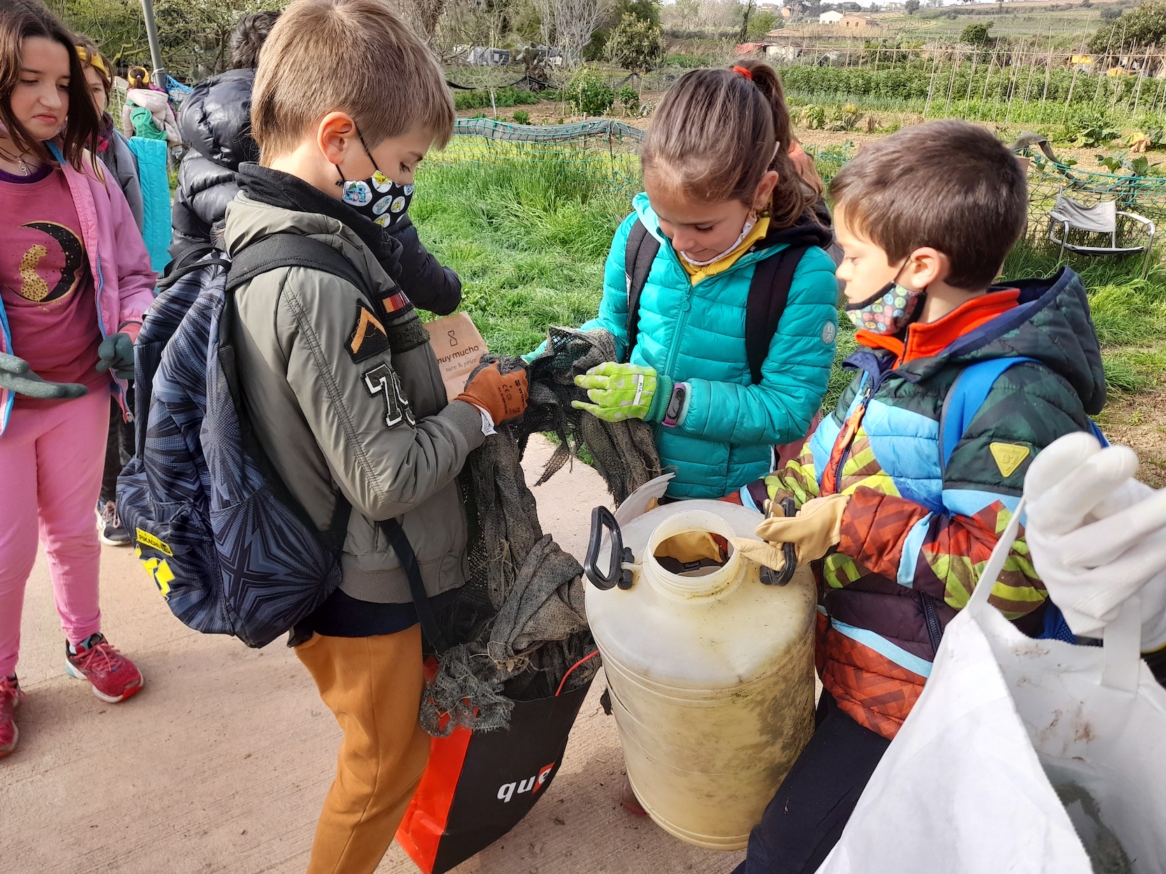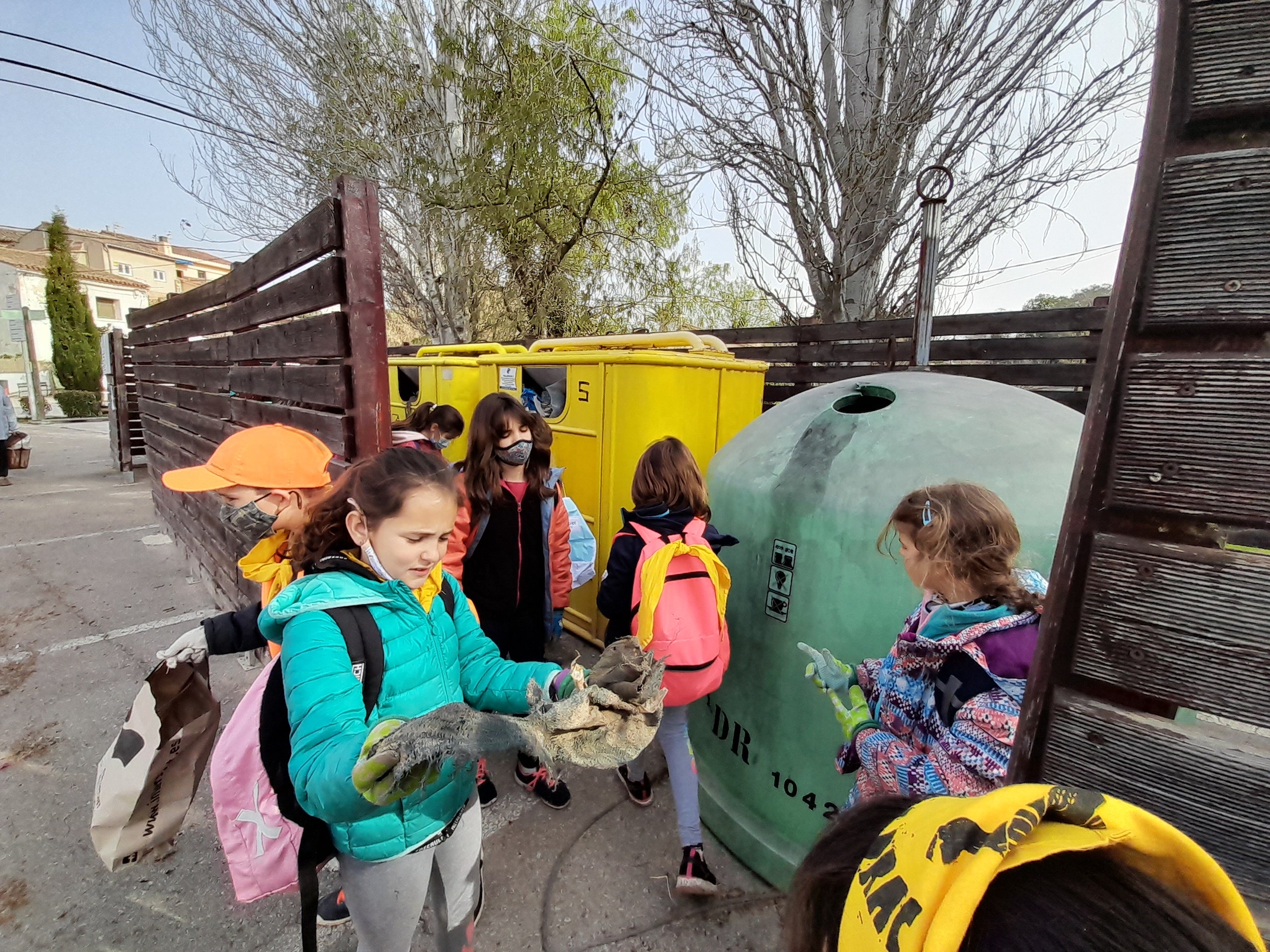Així doncs, el dilluns 28 de març hem sortit ben d’hora  per a recollir les restes no biodegradables dels voltants de la nostra escola. I quina ha estat la nostra sorpresa quan, no hem arribat a fer gaires metres i ja hem tingut les bosses ben plenes. Hem trobat: moltes llaunes, burilles de cigarretes, vidres, restes de material d’obres, taps, algunes deixalles voluminoses i inesperades com un cotxet de nadó, una placa de televisió i els seus components, una part d’un gat hidràulic; i sobretot moooolts plàstics. Hem pogut observar que l’aigua de la riera de Pacs està molt bruta i no sembla pas bruta de fang. No ens ha agradat gens el que hem vist. Hem fet una parada als contenidors per llençar de manera selectiva les deixalles que portàvem i hem continuat el nostre recorregut.