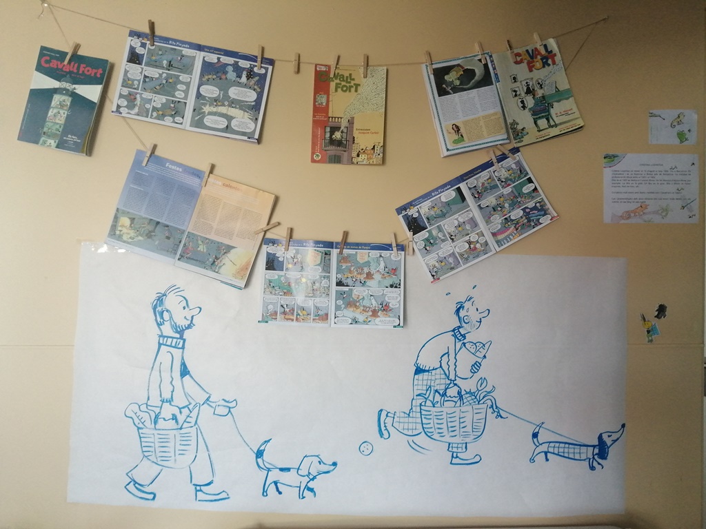 A l’entrada de l’escola hem muntat l’exposició amb llibres, contes, revistes, tots il·lustrats per ella i molts dibuixos seus, amb fulls d’informació.