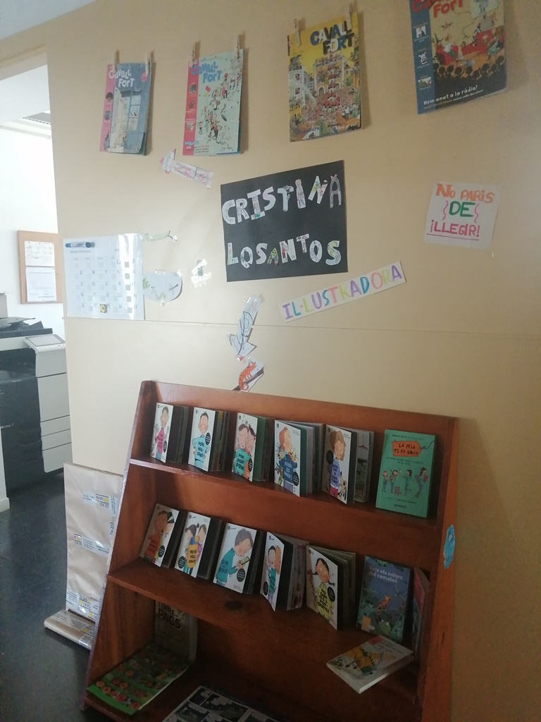 A l’entrada de l’escola hem muntat l’exposició amb llibres, contes, revistes, tots il·lustrats per ella i molts dibuixos seus, amb fulls d’informació.