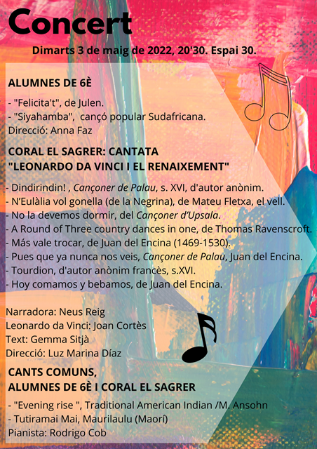 Demà a les 20’30 celebrarem el Concert de nit de la Coral d’El Sagrer i els alumnes de 6è, a l’Espai 30. Habitualment aquest Concert conjunt tenia lloc pels volts de Nadal i al gimnàs de l’escola, però enguany, per la Covid, ens vam veure obligats a posposar-lo. És obert a tota la comunitat educativa.