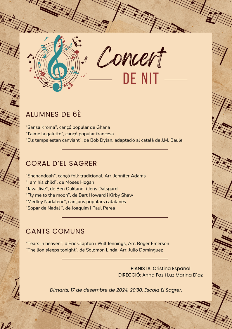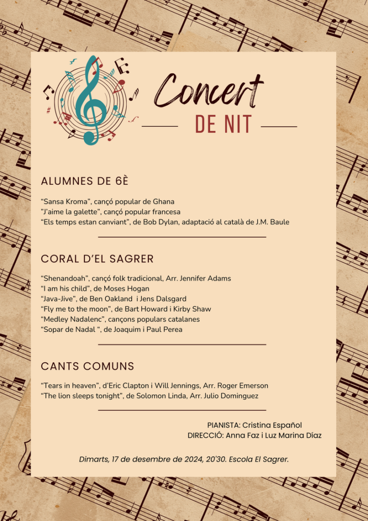 Avui a les 20:30 al gimnàs de l’escola tindrà lloc el Concert de Nit, on l’alumnat de 6è i la coral d’El Sagrer interpretaran un bonic repertori. Us en deixem el programa de mà.