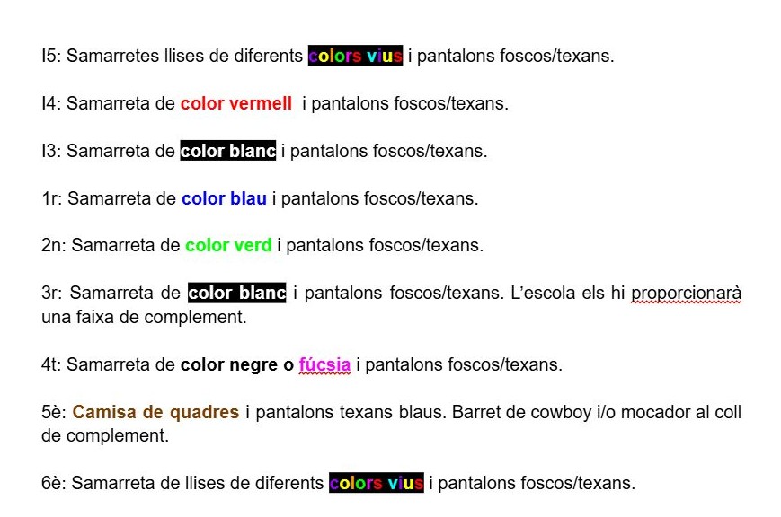 Per la ballada de danses els alumnes hauran de portar de casa el següent vestuari i i complements: