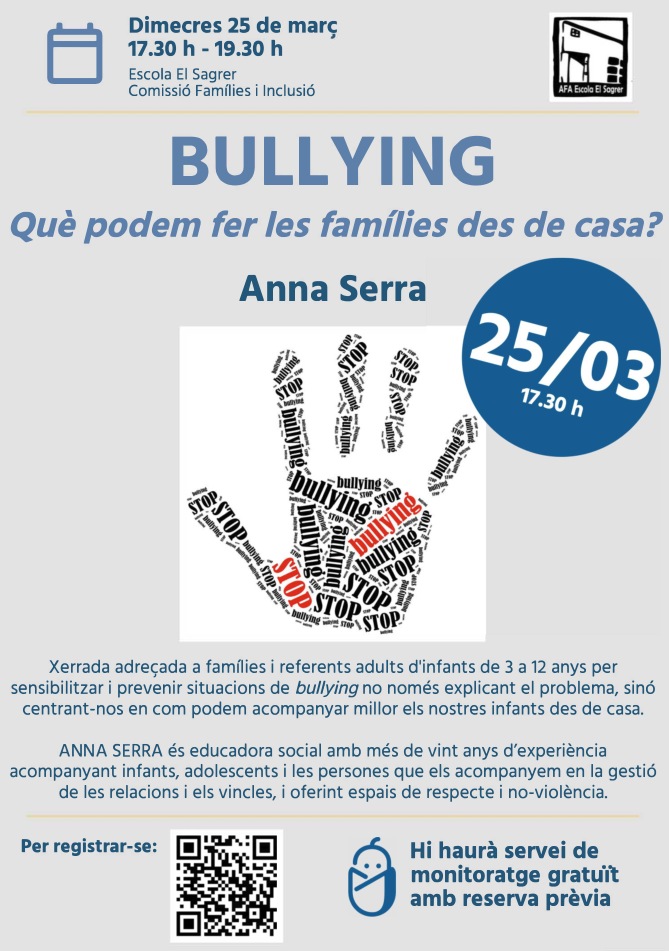Des de la Comissió de FAMÍLIES i INCLUSIÓ de l’AFA del Sagrer, us convidem a la xerrada que estem preparant amb molta il·lusió: “BULLYING: què podem fer les famílies des de casa?”, a càrrec d’Anna Serra.
