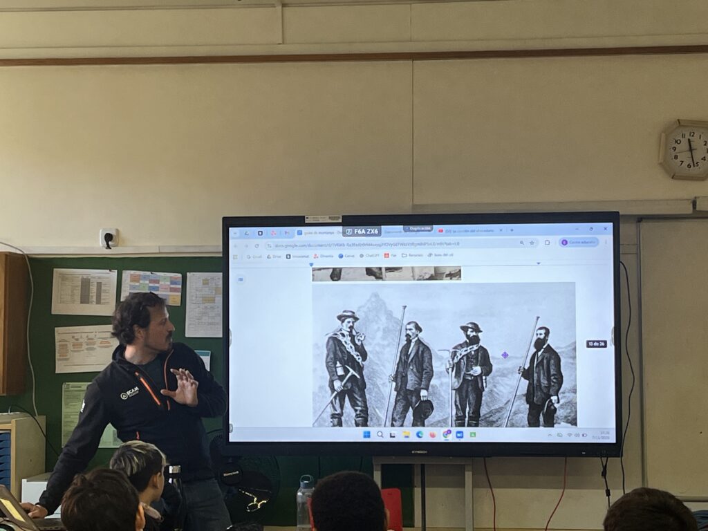 En Manu (que és pare de dos alumnes de l’escola) és guia de muntanya i això vol dir que es dedica professionalment a acompanyar persones en les seves aventures en aquest entorn (vies ferrates, barranquisme, fer cims, ski de muntanya…). Gràcies a ell, vam poder descobrir com va néixer aquesta professió, com ha canviat amb el pas del temps i també vam poder rebre consells i analitzar allò que hem de tenir en compte quan sortim a la muntanya.