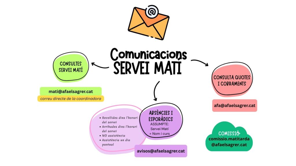 - Avisos: IMPORTANT: Recollides o arribades dins l’horari de servei, no assistència etc. A l’assumpte indicar el servei al que afecta, en aquest cas “Servei Matí + Nom i curs”. avisos@afaelsagrer.cat