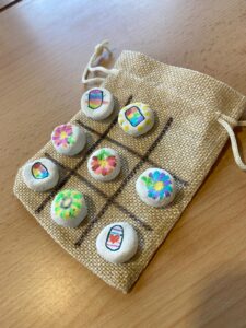A més a més, hem fet un tres en ratlla de viatge. Hem fet les fixes amb fang, les hem pintat amb retoladors i hem fet el taulell a una bosseta de ràfia. Diversió garantida tant dins de l’aula com quan anem de viatge!