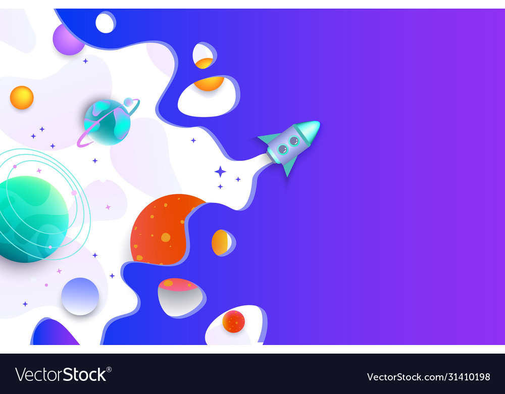 Space universe banner with rocket and galaxy planets, flat vector illustration.