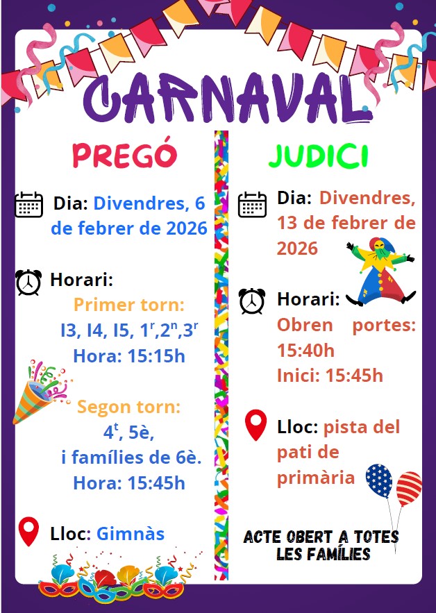 ARRIBA EL CARNESTOLTES!!!! Feu un comentari / Per admin / 6 de febrer de 2026 / AFA COMUNITAT DE MITJANS I GRANS COMUNITAT DE PETITS General Portada Avui és un gran dia!!! Avui arriba el Rei Carnestoltes i dilluns comencem la setmana més esbojarrada de l’any!!!!