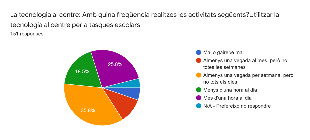 El 26% dels alumnes enquestats afirmen utilitzar més d’una hora al dia la tecnologia al centre per a tasques escolars. Un 18’7% menys d’una hora al dia i u 36% afirmen utilitzar-la al menys una vegada a la setmana però no tots els dies.