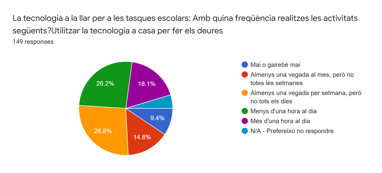El 18’2% dels alumnes enquestats afirmen utilitzar més d’una hora al dia la tecnologia a casa per fer els deures. El 18’5% menys d’una hora diària. El 27% al menys un cop a la setmana però no tots els dies i el 9’5% afirmen que mai o gairebé mai utilitzen la tecnologia a casa per fer els deures.