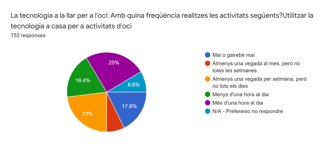 El 47’7% dels alumnes enquestats afirmen utilitzar la tecnologia per a activitats d’oci a casa, mentre que un 23,2% ho fa almenys un cop a la setmana però no tots els dies.