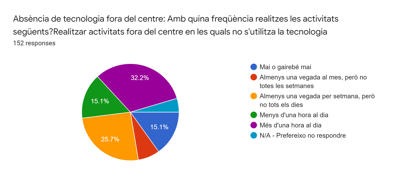 El 32’5% dels alumnes enquestats afirmen realitzar activitats fora del centre en les quals no s’utilitza la tecnologia més d’una hora al dia, mentre que un 15,2% afirmen fer-ho menys d’una hora diària.