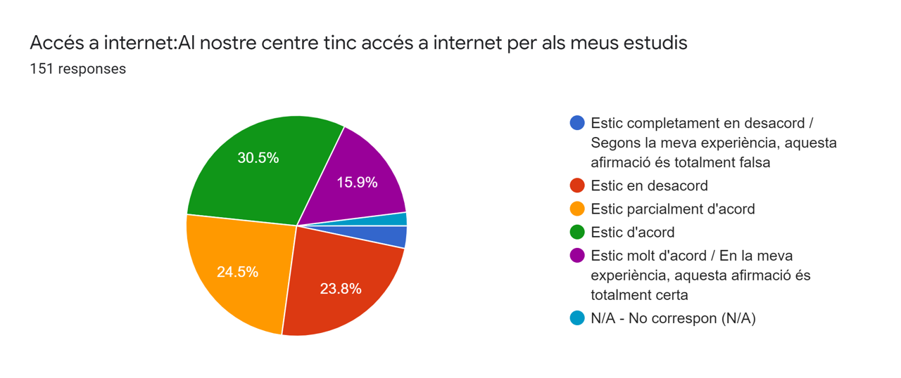 El 71’4 % dels alumnes enquestats estan d’acord o molt d’acord en que el nostre centre té accés a internet per a cursar els seus estudis. Mentre que un 3’3 % es mostren totalment en desacord amb aquesta afirmació.