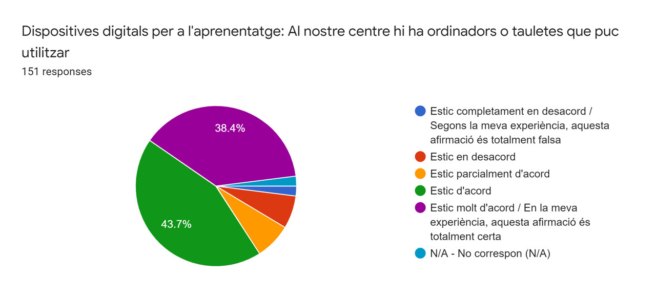 El 89’3 % dels alumnes enquestats estan d’acord o molt d’acord en que al nostre centre hi ha ordinadors o tauletes que poden utilitzar.
