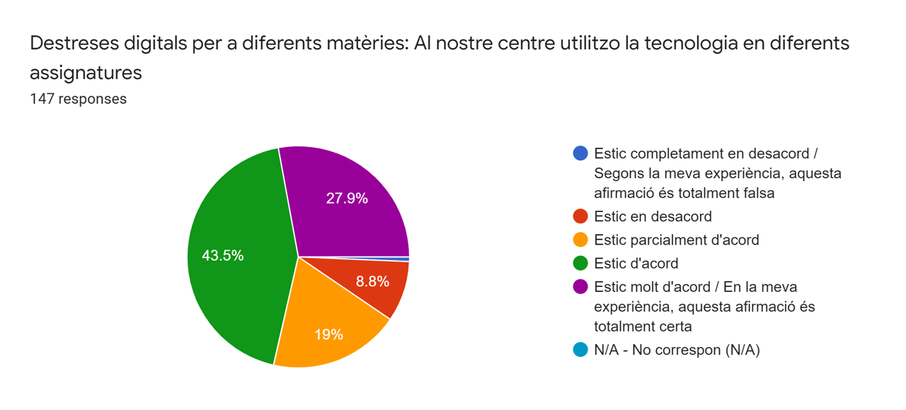 El 91’1% dels alumnes enquestats estan d’acord o molt d’acord en que al nostre centre utilitzen la tecnologia en diferents assignatures.