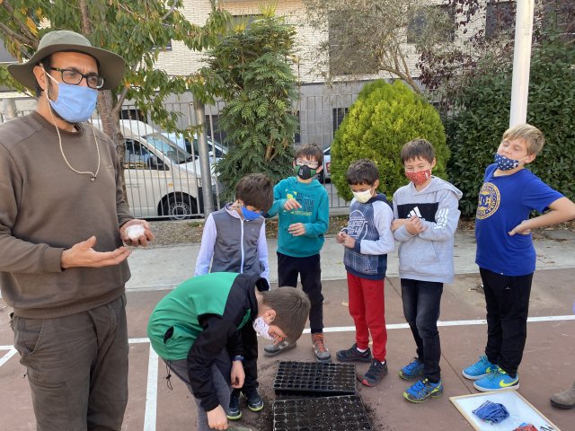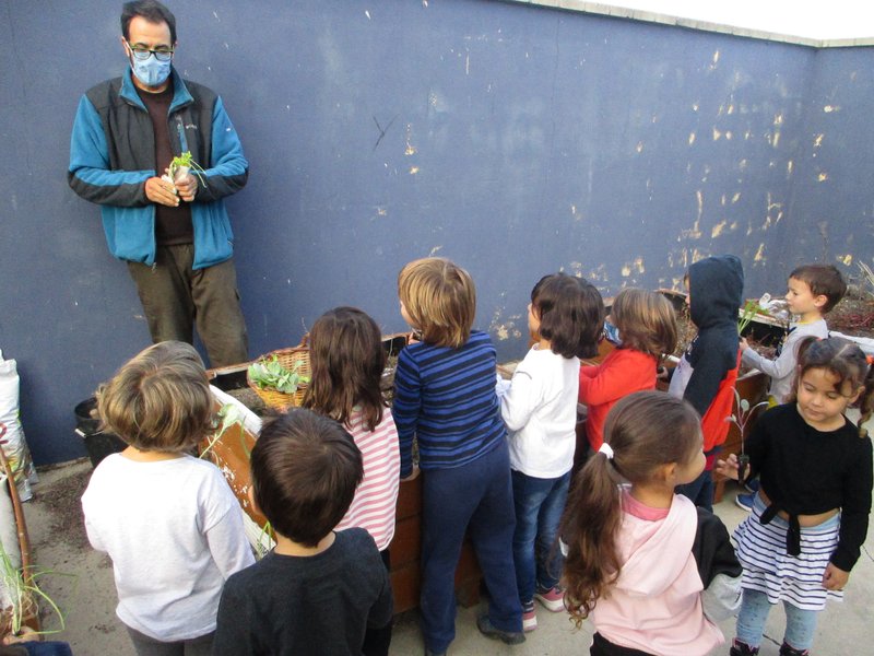 Avui els alumnes de Cicle Inicial hem plantat a l’hort. Primer el Dani ens ha explicat moltes coses que no