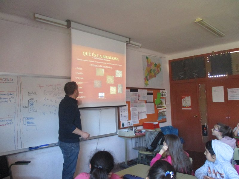 Aquest trimestre a Cicle Mitjà estem treballant les energies renovables. El dijous 4 d’abril va venir un pare de l’escola, el Carles Vidal, a explicar-nos una mica què és la biomassa i d’on prové. Ens va portar mostres i també ens va ensenyar la caldera del pavelló i el seu funcionament. Ara ja en sabem una miqueta més! Li estem molt agraïts per haver-nos dedicat aquest temps.