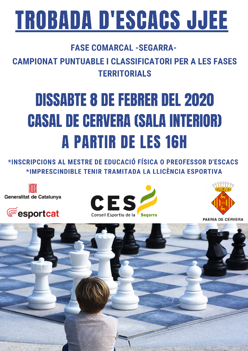 El proper DISSABTE 8 DE FEBRER realitzarem la fase comarcal d’escacs dels JJEE.