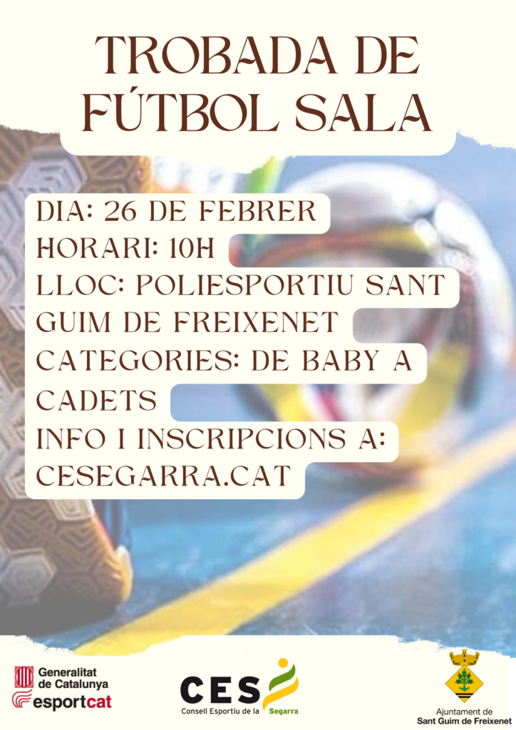 El proper diumenge dia 26 de Febrer, es realitzarà la trobada comarcal de Futbol Sala a Sant Guim de Freixenet!