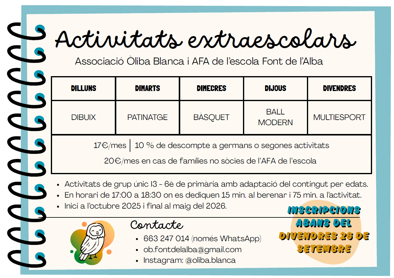 Des de l’AFA (Associació de Families d’Alumnes) us fem arribar a continuació la informació sobre les EXTRAESCOLARS d’aquest curs 2025/2026. Aquesta informació també la rebreu en paper.