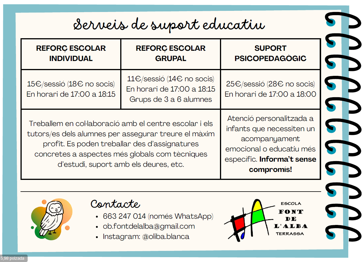 La NOVETAT d’aquest curs es que tenim una nova empresa que gestionarà les activitats extraescolars, ÒLIBA BLANCA.