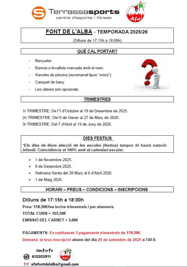 Podeu lliurar les inscripcions a les bústies de l’AFA (a les portes), a la safata del mostrador de l’escola o , per totes les activitats excepte piscina, les podeu enviar al correu electrònic ob.fontdelalba@gmail.com.