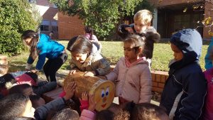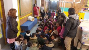 Aquest matí ,els més petits de l’escola hem sortit al pati a buscar el Tió.L’hem trobat ,pobret,estava mort de fred.Li hem posat una manteta i ara toca donar-li menjar perquè cagui moltes neules i torrons