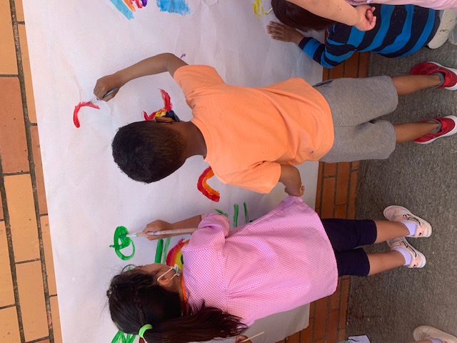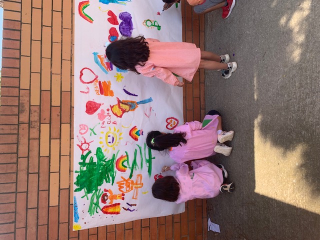 Hem realitzat aquesta activitat al pati, on cada infant ha estat lliure de dibuixar i expressar el que sentia a través del pinzell al paper, escoltant una peça musical clàssica. També hem treballat el traç vertical.