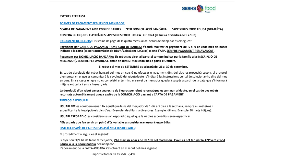 Preus i forma de pagament menjador curs 2022-23