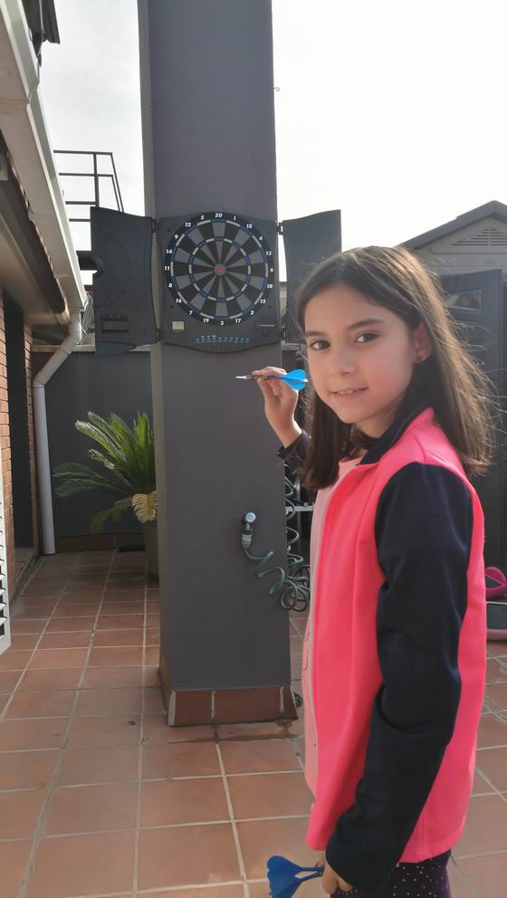 Aquí tenim tres fotos de la Berta fent diferents activitats: jugant als dards, treballant a la cuina i preparant carn a la barbacoa!!!