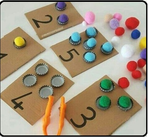 MATEMÀTIQUES: Relacionar nombre amb la seva quantitat. Aquesta activitat consisteix en agafar els números de l’1 al 10 que tinguem per casa de plàstic, fusta, dibuixar-los en un paper… els disposarem distribuïts en una taula i els infants hauran de posar-hi tants llegums, pasta, botons, pinces… (el que tingueu per casa) com indiqui el número. EXEMPLE: