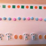 - Mates: seriacions. Es tracta de fer un model i els alumnes l’han d’imitar diverses vegades. A la imatge ho fan amb gomets, però ho podeu fer amb qualsevol material que tingueu a casa. A més a més podeu afegir un altre element i fer les seriacions de 3.