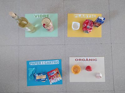 Classificar diferents materials segons els colors dels contenidors que hi ha (plàstic, paper i cartró, vidre i orgànic) → En aquesta activitat necessitarem 4 folis que representin els quatre contenidors treballats ( plàstic, paper i cartró, vidre i orgànic), posant-li el color o donant-li la representació de la manera més senzilla que trobem pels infants. Una vegada els infants tenen clar què vol dir cada foli, hauran de buscar diferents materials que hi hagi per casa i col•locar-los en el lloc corresponent.