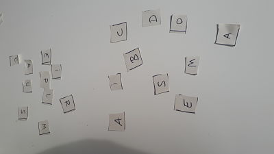 Joc del “scrabble” en un full escrivim en una quadrícula (es pot fer a mà) totes les lletres de l’abecedari i després afegim totes les vocals tres vegades retalleu-les i poseu-les en una bosseta. Per començar que el nen/a agafi 10 lletres i el pare/mare també 10 lletres. Es tracta de formar paraules amb les lletres que hem agafat a l’atzar. Conteu després quantes paraules heu aconseguit cadascú.