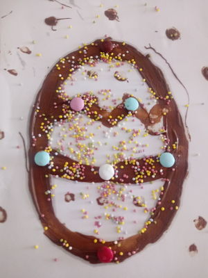 Avui us proposo que gaudiu amb els vostres fills/es d’una activitat experimental i artística aprofitant la motivació de “la mona i els ous de xocolata”d’aquesta festa de pasqua que tenim tant present. Només ens caldrà dibuixar un ou o buscar-ne un de dibuixat, i materials per resseguir-lo i decorar-lo, podeu fer servir els que vulgueu, jo us deixo algunes idees: llapis de colors, ceres, retoladors, pintures, gomets, pompons, fins i tot, podeu fer servir xocolata desfeta, virutes… El més important és que sigueu creatius i gaudiu molt fent-lo.