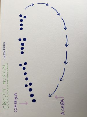 3. Construïm el circuit musical: a continuació veureu una imatge de com ha de ser, es pot construir amb papers, gomets, aros, … el que tingueu per casa. El circuit ha de ser circular, ja que es repeteix dues vegades.