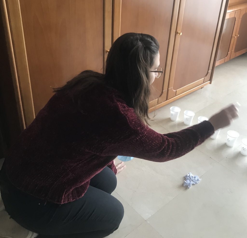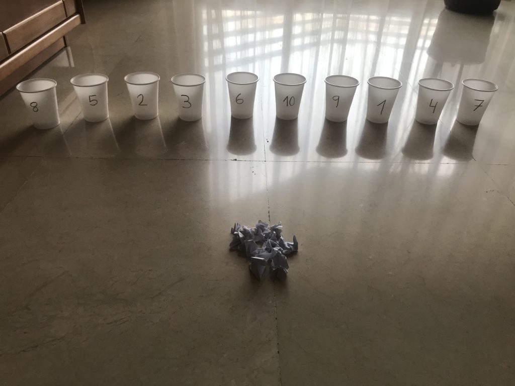 - Matemàtiques: numeració. L’activitat consisteix a encistellar tantes boles de paper com marqui el número. Prèviament haureu de preparar 5, 7 o 10 gots de plàstic amb el número escrit amb retolador al frontal del got. En cas que no tingueu gots de plàstic ho podeu fer amb qualsevol recipient enganxant un tros de paper amb el número. Després haureu de fer boles de paper i es tractarà que l’infant relacioni la grafia del número de cada got amb la quantitat de boles de paper a encistellar. Es recomana preparar els gots o els recipients amb els alumnes perquè també puguin practicar les grafies dels números treballats.