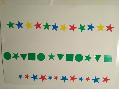 Per exemple: L’adult inicia la seriació col•locant quatre gomets, un gomet de cercle blau, un gomet de cercle groc, un gomet de cercle verd i un gomet de cercle vermell. L’infant continua la seriació seguint el que l’adult a iniciat i posarà: un gomet de cercle blau, un gomet de cercle groc, un gomet de cercle verd, un gomet de cercle vermell i així successivament.