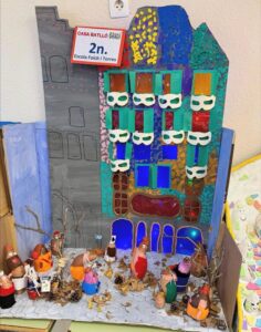 Arriba la tardor a l’escola i, com cada any, arriba el moment de vestir els moniatos per a participar a la festa de La Castanyada del poble! A segon, aprofitant que tota l’escola està treballant les obres de Gaudi, hem decidit fer una maqueta de la Casa Batlló i així hem après a reconèixer els diferents elements artístics d’aquesta façana emblemàtica. Hem creat finestres i balcons amb cartolina, hem elaborat la vorera del Passeig de Gràcia imitant les rajoles de Gaudí, hem recreat la part superior amb petits papers que simulen les escames d’un animal, hem vestit el carrer de tardor amb elements naturals i finalment hi hem afegit els nostres moniatos turistes! Ha estat una experiència engrescadora i estem molt orgullosos/es del resultat. Esperem que us agradi tant com a nosaltres!