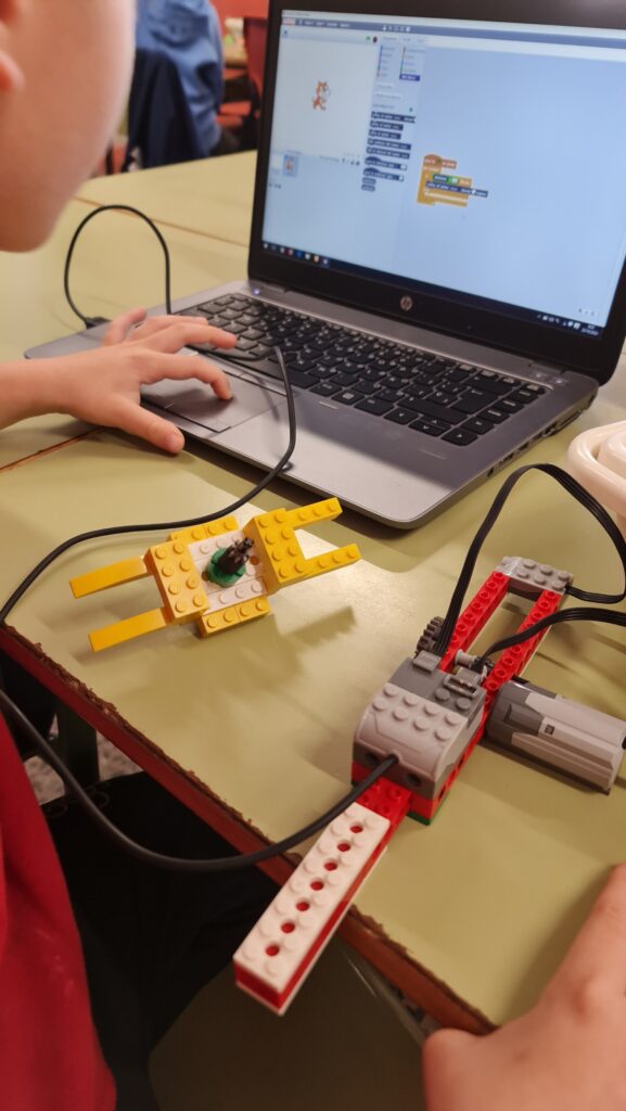 L’alumnat de 3r a robòtica fa construccions amb Lego que després programa amb Scratch, fan que es mogui connectat a l’ordinador inclús li afegeixen sons.