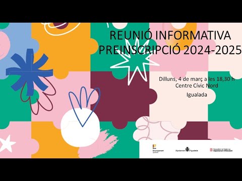 DILLUNS 4 DE MARÇ A LES 18.30H REUNIÓ INFORMATIVA PER LA PREINSCRIPCIÓ DLE CURS ESCOLAR 24/25 https://youtu.be/FmMavLMvmd4 La reunió es farà també de manera presencial a l’auditori del Centre Cívic Nord, c/ Sant Martí de Tous,6.