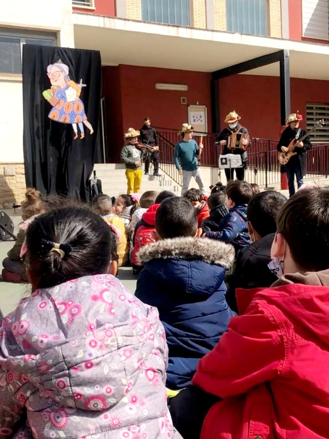 Hem rebut la visita de la Vella Quaresma, la qual ha aparegut al bell mig del pati acompanyada per un pintoresc personatge, el Carni. Al Carni li agrada molt la festa i gaudeix fent gresca, ballant i cantant! Porta uns músics molt eixerits amb uns barrets ben divertits!