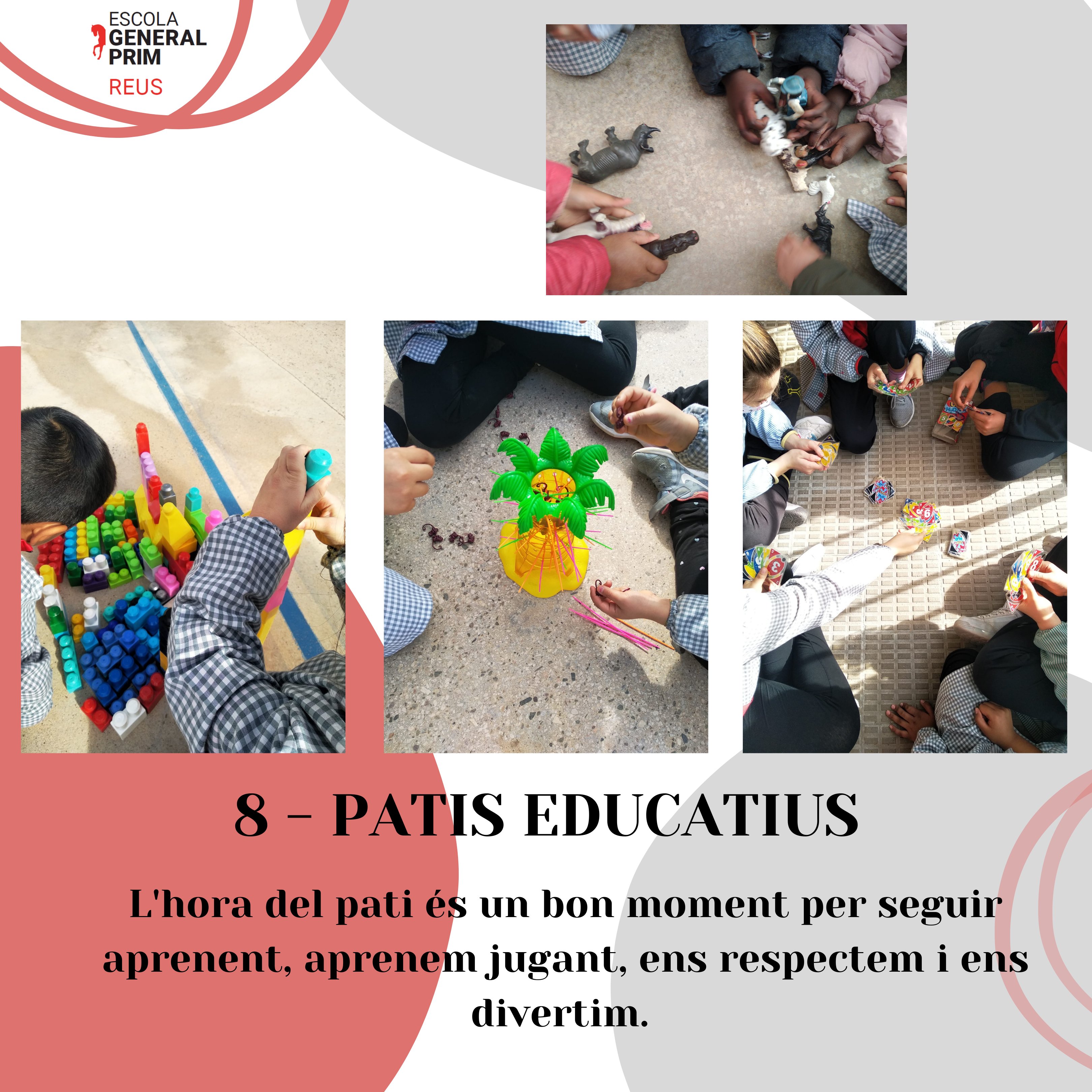 8.- Patis educatius. L’aprenentatge no succeeix només a les aules, l’hora del pati és un bon moment per gaudir del joc, relacionar-nos, posar ens pràctica els habilitats socials i sobretot divertir-nos. #escolageneralprim #totsfemescola #portesobertes #pública #xepr